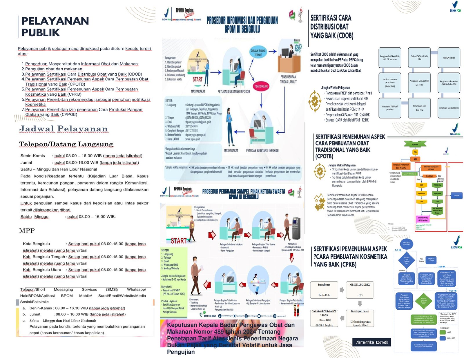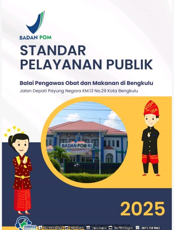 Berita Standar Pelayanan Publik BPOM di Bengkulu Penulis DK Media Redaksi - 23/05/2025 0 45 Standar Pelayanan Publik BPOM di Bengkulu. Baca Juga: Padang Panjang Terisolasi, Wawako Yakin Presiden Prabowo Turun Tangan Percepat Pemulihan