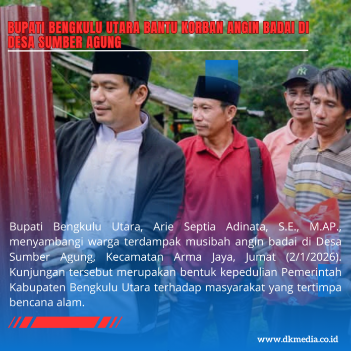 Bengkulu Utara – Bupati Bengkulu Utara, Arie Septia Adinata, S.E., M.AP., menyambangi warga terdampak musibah angin badai di Desa Sumber Agung, Kecamatan Arma Jaya, Jumat (2/1/2026). Kunjungan tersebut merupakan bentuk kepedulian Pemerintah Kabupaten Bengkulu Utara terhadap masyarakat yang tertimpa bencana alam.