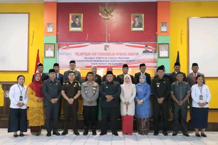 Mukomuko – Bupati Mukomuko, H. Choirul Huda, S.H., secara resmi melantik 10 Pejabat Pimpinan Tinggi Pratama (Eselon II) hasil seleksi terbuka atau lelang jabatan, Senin (12/1/2026). Pelantikan digelar di Aula Bapperida/Bappeda Kabupaten Mukomuko sekitar pukul 02.30 WIB.