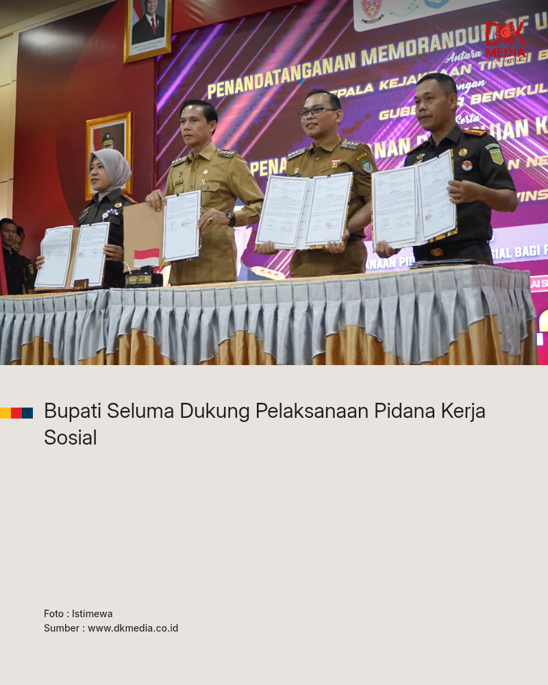 Bengkulu – Bupati Seluma, Teddy Rahman, S.E., M.M., menyatakan dukungan penuh terhadap penerapan pidana kerja sosial sebagai alternatif pemidanaan di wilayah Provinsi Bengkulu. Hal ini disampaikannya saat menghadiri penandatanganan Memorandum of Understanding (MoU) antara Kejaksaan Agung RI dan Pemerintah Provinsi Bengkulu, serta Perjanjian Kerja Sama (PKS) antara para kepala daerah dengan Kejaksaan Negeri se-Provinsi Bengkulu di Balai Semarak, Selasa (25/11/2025).
