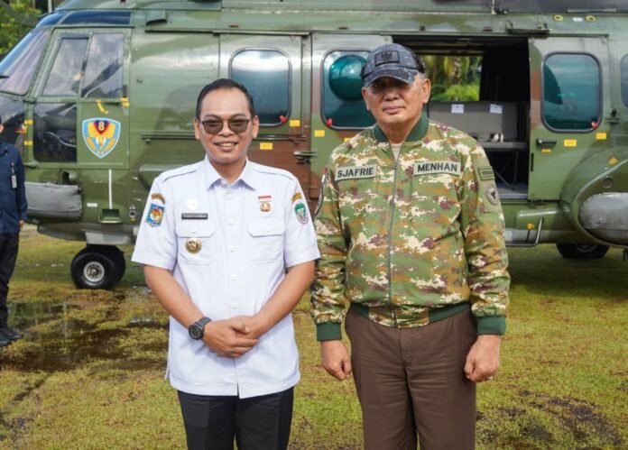 Seluma – Bupati Seluma, Teddy Rahman, bersama Dandim 0425 Seluma mengantar kepulangan Menteri Pertahanan RI, Sjafrie Sjamsoeddin, menuju helikopter untuk melanjutkan perjalanan kembali ke Jakarta, Rabu (1/4/2026) di Lapangan Bola Lubuk Kebur.