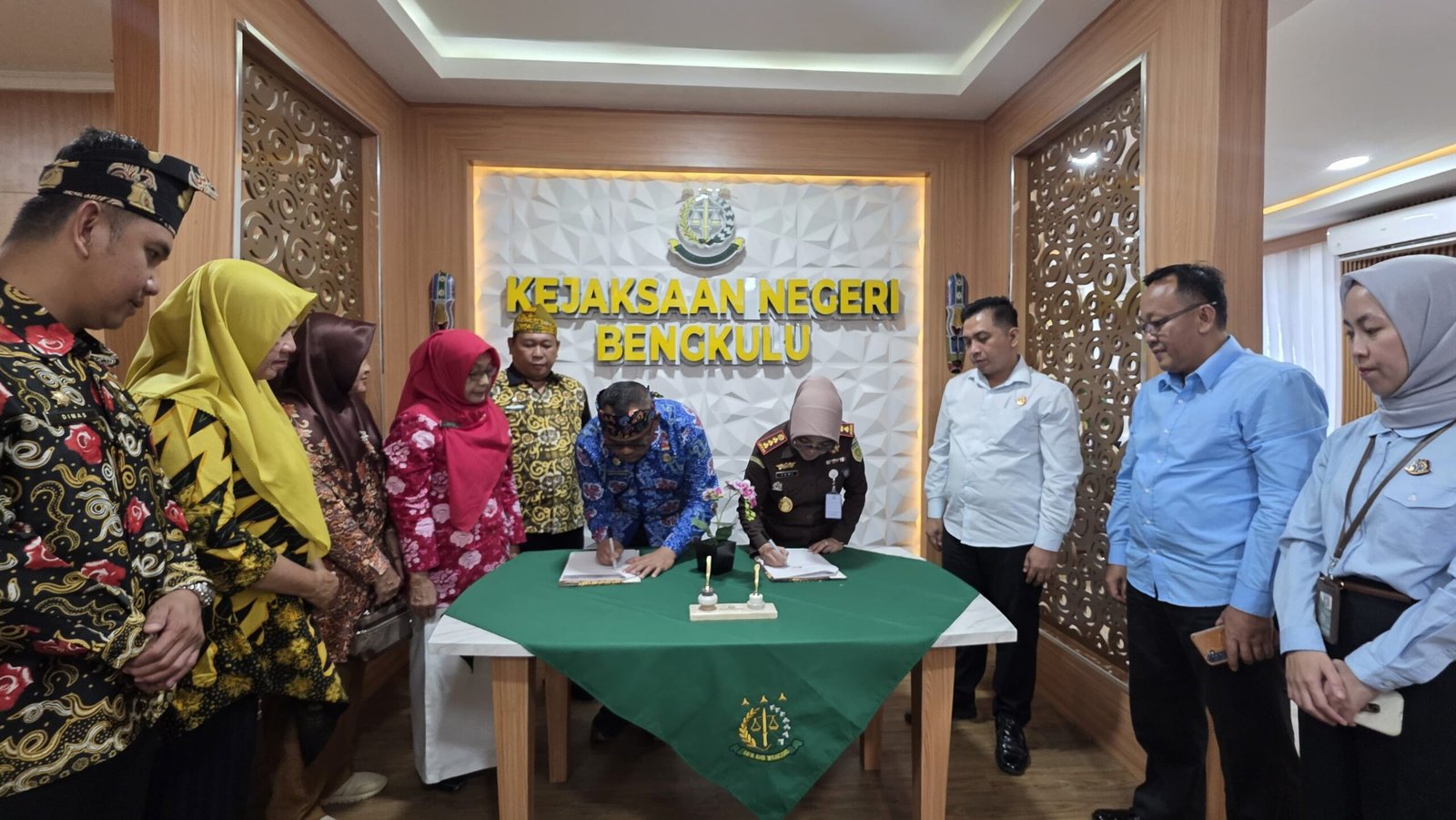 Penandatanganan MoU disaksikan oleh Kasi Datun Kejari Bengkulu beserta jajaran jaksa, Sekretaris Dinsos Kota Bengkulu, serta para kabid dan staf.