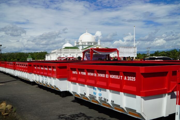 Bengkulu – Sebagai wujud nyata komitmen Pemerintah Provinsi Bengkulu dalam menciptakan lingkungan yang bersih, sehat, dan indah, Gubernur Bengkulu Helmi Hasan menyerahkan 102 unit bak arm roll (kontainer sampah) dan 2 unit kendaraan arm roll (truk sampah) kepada pemerintah kabupaten/kota se-Provinsi Bengkulu.