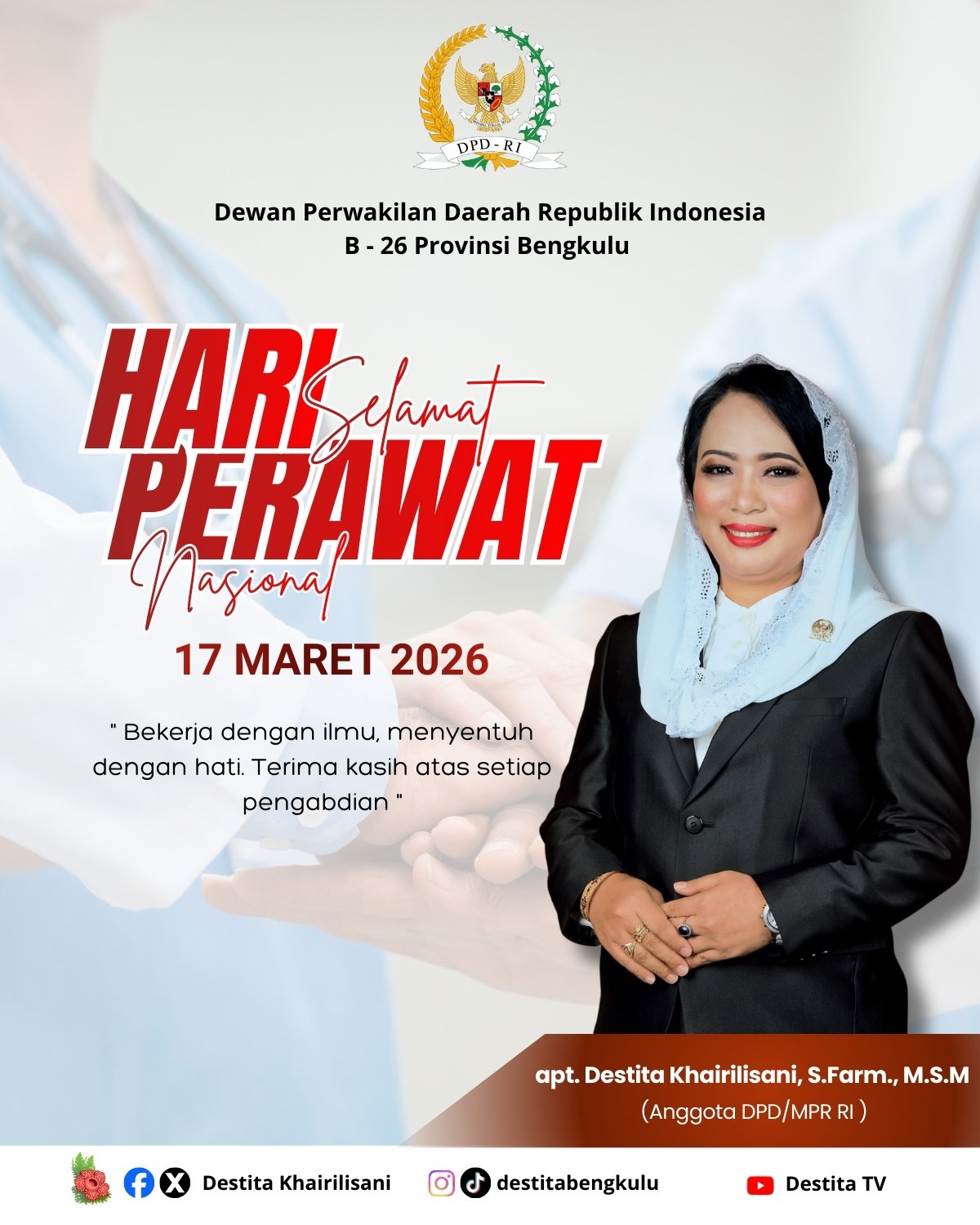 Bengkulu – Anggota DPD RI/MPR RI dapil Bengkulu, Apt. Destita Khairilisani, S.Farm., M.S.M., menegaskan perawat memiliki peran penting sebagai garda terdepan dalam sistem pelayanan kesehatan di Indonesia.