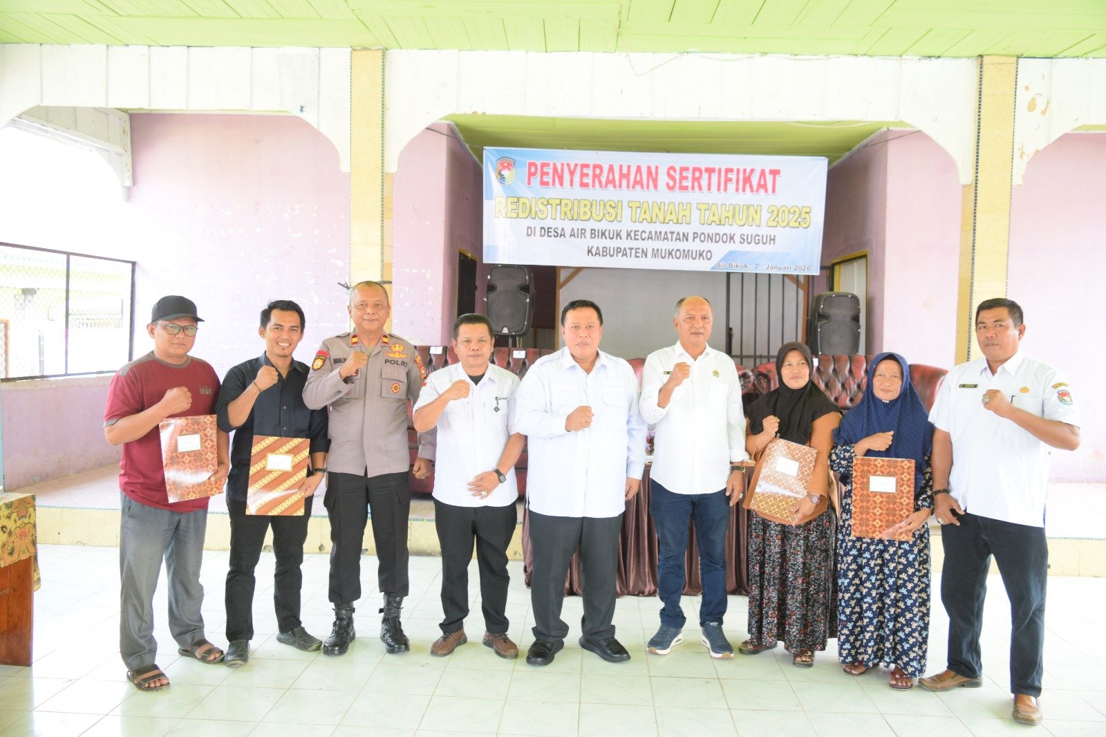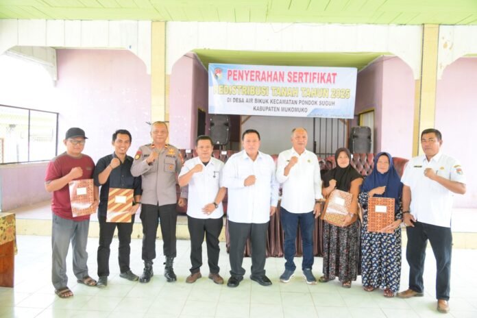 Mukomuko — Pada hari Rabu, 21 Januari 2026, Pemerintah Kabupaten Mukomuko bersama Kantor Pertanahan Kabupaten Mukomuko melaksanakan kegiatan Penyerahan Sertipikat Redistribusi Tanah Tahun 2025 kepada masyarakat Desa Air Bikuk, Kecamatan Pondok Suguh. Kegiatan ini merupakan wujud komitmen pemerintah dalam memberikan kepastian hukum hak atas tanah serta mendukung pemerataan penguasaan dan pemanfaatan tanah bagi masyarakat.