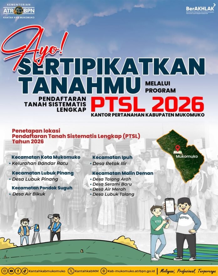 Mukomuko – Penetapan lokasi Program Pendaftaran Tanah Sistematis Lengkap (PTSL) Tahun Anggaran 2026 untuk masyarakat Kabupaten Mukomuko telah resmi ditetapkan.