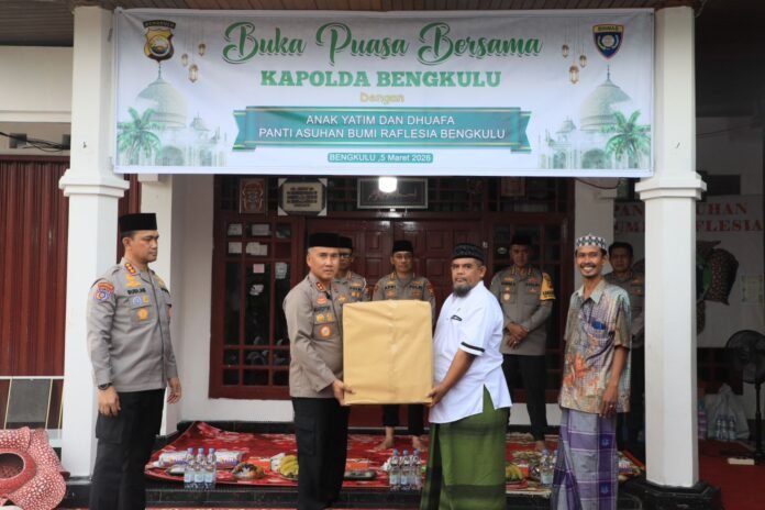 Bengkulu – Kapolda Bengkulu, Irjen Pol Mardiyono, S.I.K.,M.Si, melaksanakan buka puasa bersama anak yatim dan dhuafa Panti Asuhan Bumi Rafflesia Bengkulu di Panti Asuhan Bumi Rafflesia JL. Kesehatan 1 Anggut Atas Kec. Ratu Samban Kota Bengkulu, bersama Pejabat Utama Polda Bengkulu Kamis (5/3/2026).