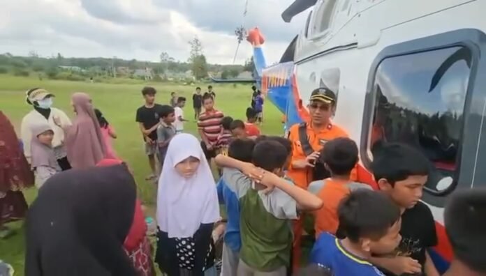 Aceh Tamiang — Dua helikopter Polri, masing-masing AW 169/P3308 dengan crew AKBP Bima Helpin, Kompol Hotman, Aipda Sugiyanto, dan Bripka Joko Edi serta Dauphin AS365/P3302 yang diawaki AKP Wiwit, Iptu Abdiel, Brigpol Ageng, dan Briptu Berlian, siang itu mendarat di Lapangan Bima Patra, Kecamatan Kejuruan Muda, Aceh Tamiang.