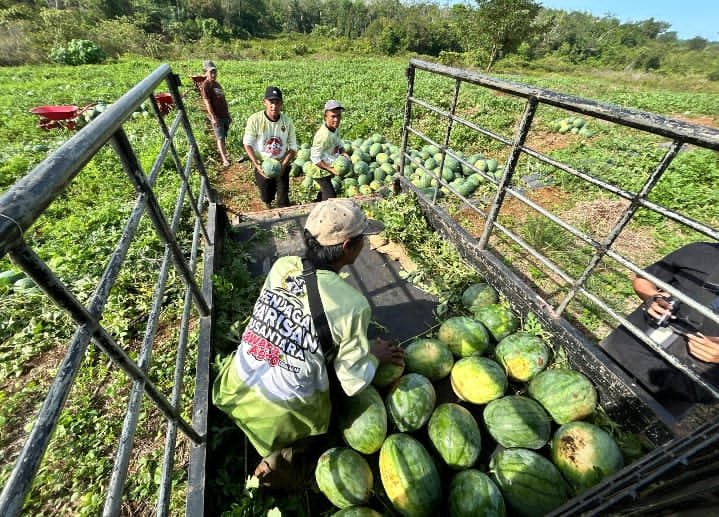 Bengkulu Tengah – Sebanyak 20 ton semangka siap jual berhasil dipanen Kelompok Tani (Poktan) Penjaga Warisan Nusantara (Jawara) Agro, mitra binaan Satgaswil Bengkulu Densus 88 AT Polri, dalam kegiatan Panen Raya yang digelar di Balai Benih Induk (BBI) Talang Aling, Kecamatan Taba Lagan, Kabupaten Bengkulu Tengah, Rabu (25/2/2026).