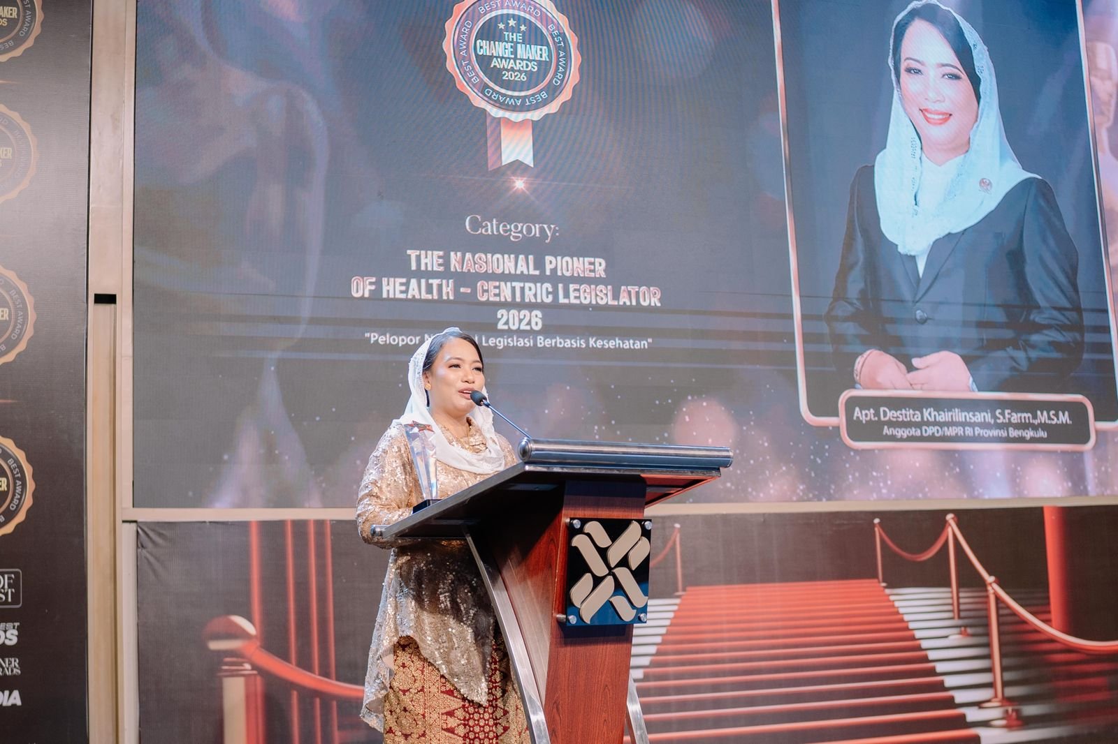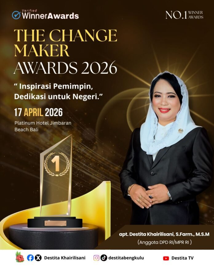 Bali – Anggota DPD/MPR RI Dapil Bengkulu, Apt. Destita Khairilisani, S.Farm., M.S.M., meraih penghargaan “The Change Maker Awards 2026” dari Seven Media Asia. Penghargaan tersebut diserahkan di Hotel Platinum Jimbaran Beach, Bali, Jumat (17/4/2026).