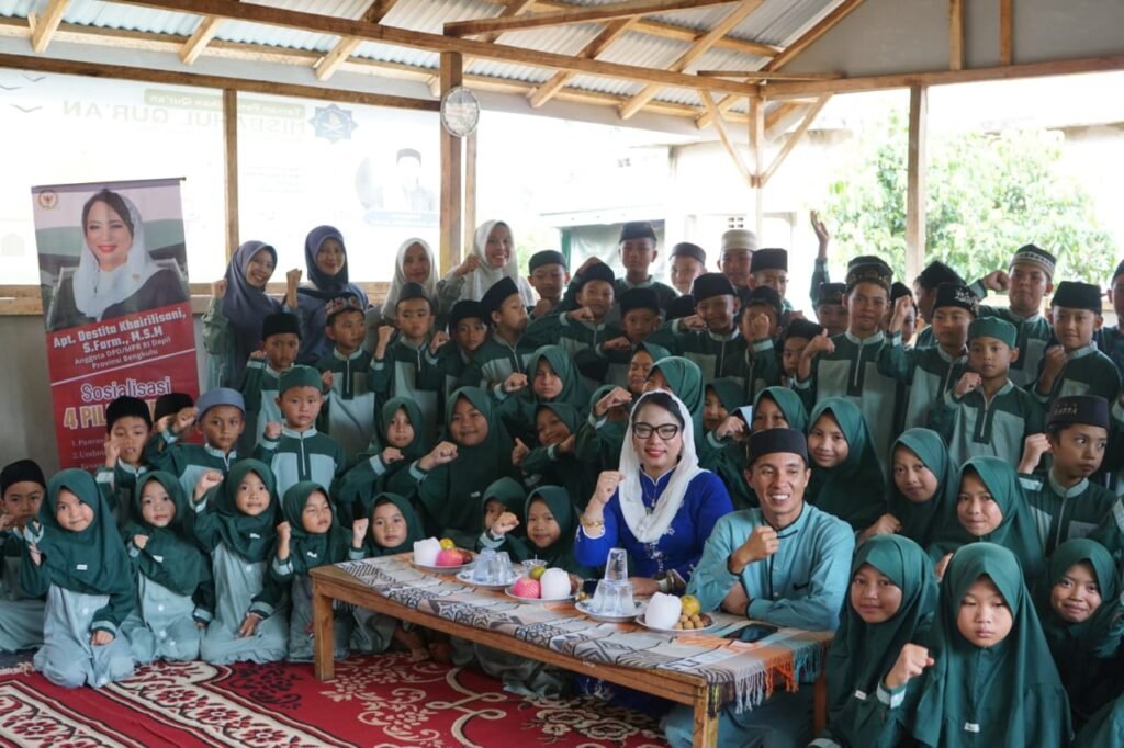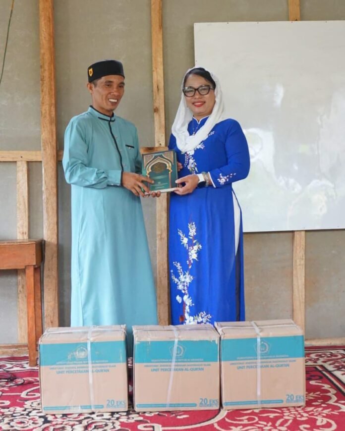 Lebong – Anggota DPD RI/MPR RI, apt. Destita Khairilisani, S.Farm., M.S.M., menyerahkan bantuan Al-Qur’an dari Kementerian Agama Republik Indonesia kepada TPQ Misbahul Qur’an, Desa Tik Telau, Kabupaten Lebong, Rabu (18/12/2025).