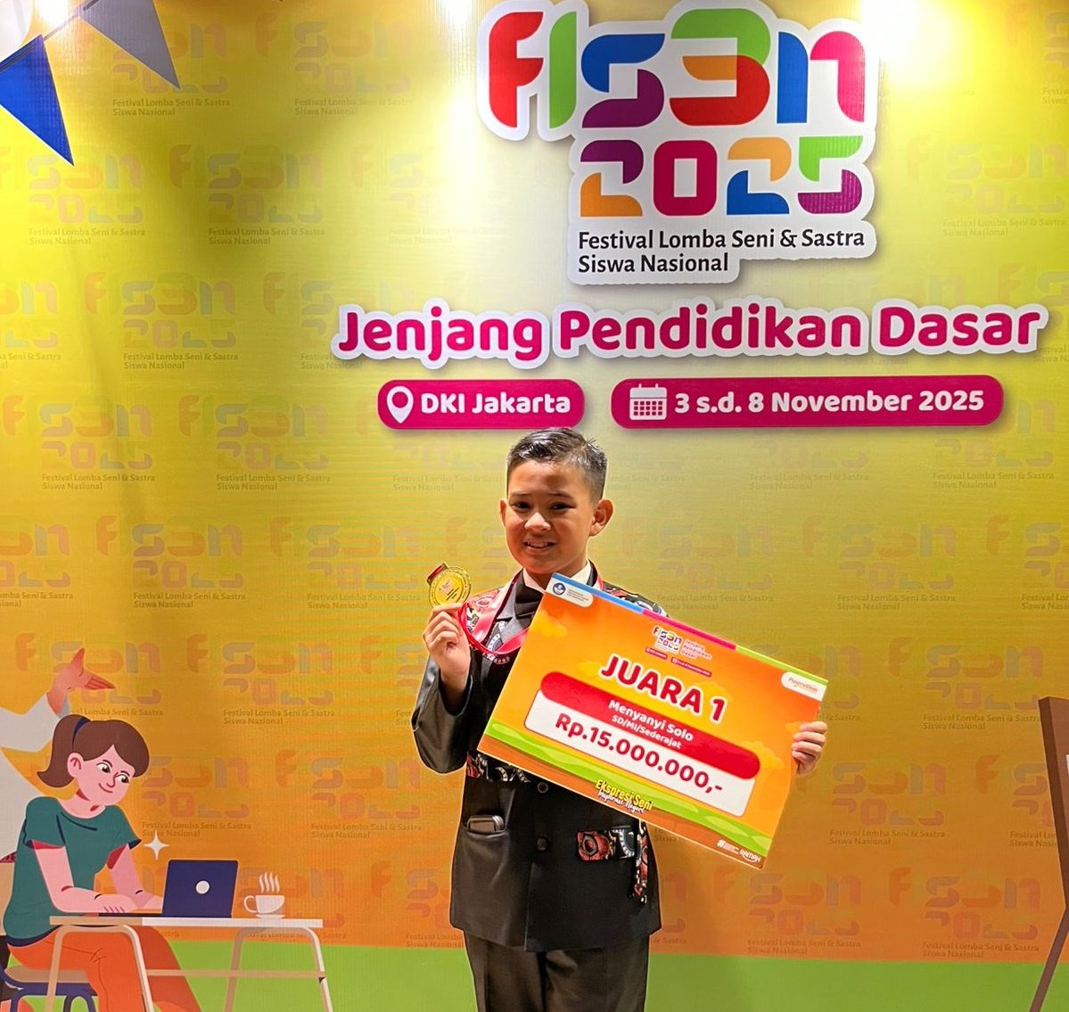 Muhammad Daniel Alfarizie, siswa SD Negeri 10 Rejang Lebong, berhasil meraih medali emas pada ajang Festival dan Lomba Seni Siswa Nasional (FLS2N) 2025.
