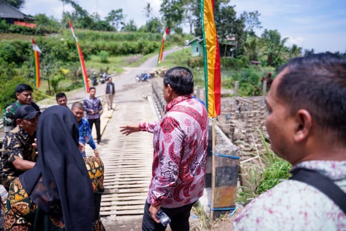 Rejang Lebong – Wakil Gubernur Bengkulu, Mian, meninjau langsung kondisi jembatan amblas di Desa Air Merah, Kecamatan Curup Tengah, Kabupaten Rejang Lebong, Kamis (2/4) siang. Jembatan yang berada di dekat musala setempat tersebut dilaporkan rusak setelah diterjang banjir beberapa waktu lalu.