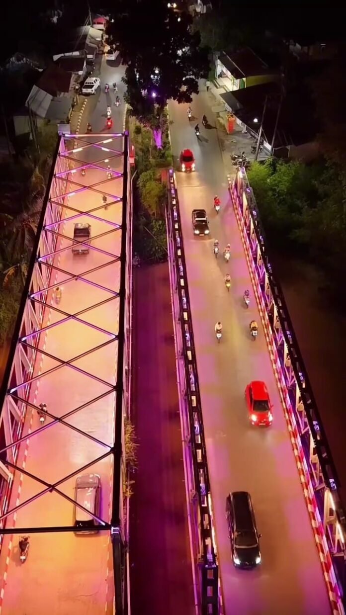 Jembatan yang sebelumnya tampak biasa saat malam hari kini bertransformasi menjadi lebih menarik dengan instalasi pencahayaan modern yang berwarna-warni.