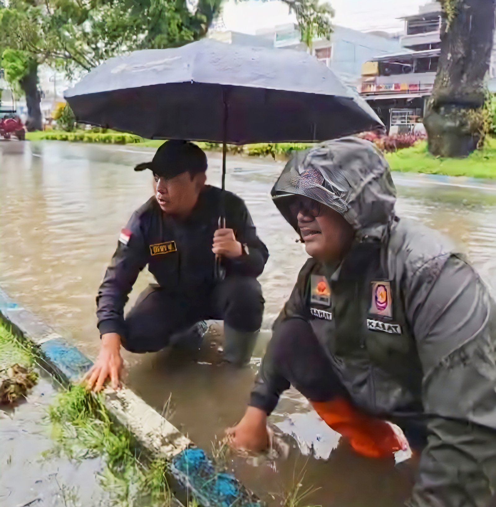Berdasarkan pantauan di lokasi, Dedy Wahyudi dan Sahat Marulitua Situmorang tampak memunguti sampah dan membersihkan saluran drainase yang tersumbat. Tumpukan sampah di aliran air tersebut menjadi penyebab utama terhambatnya aliran air hujan hingga menggenangi badan jalan.